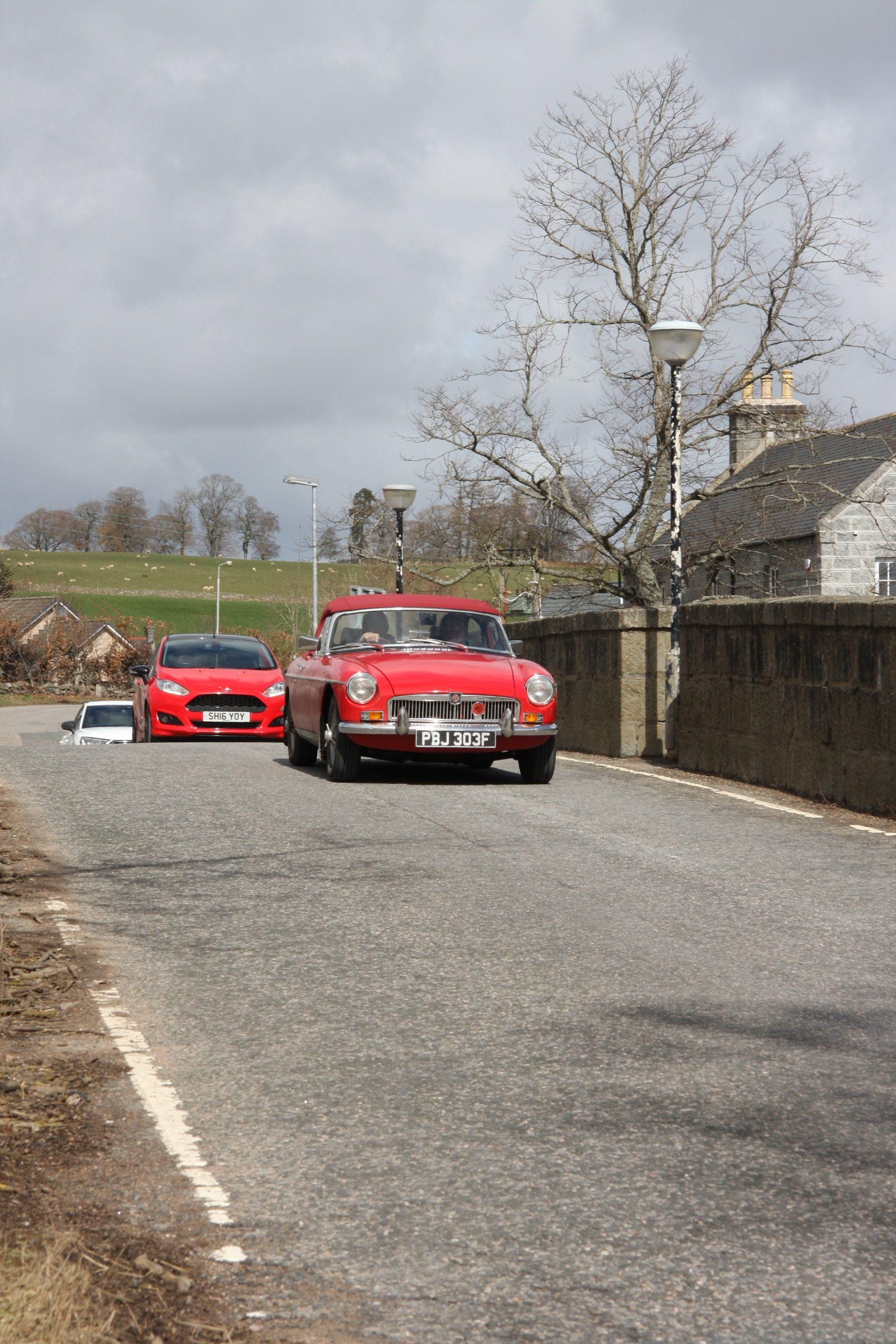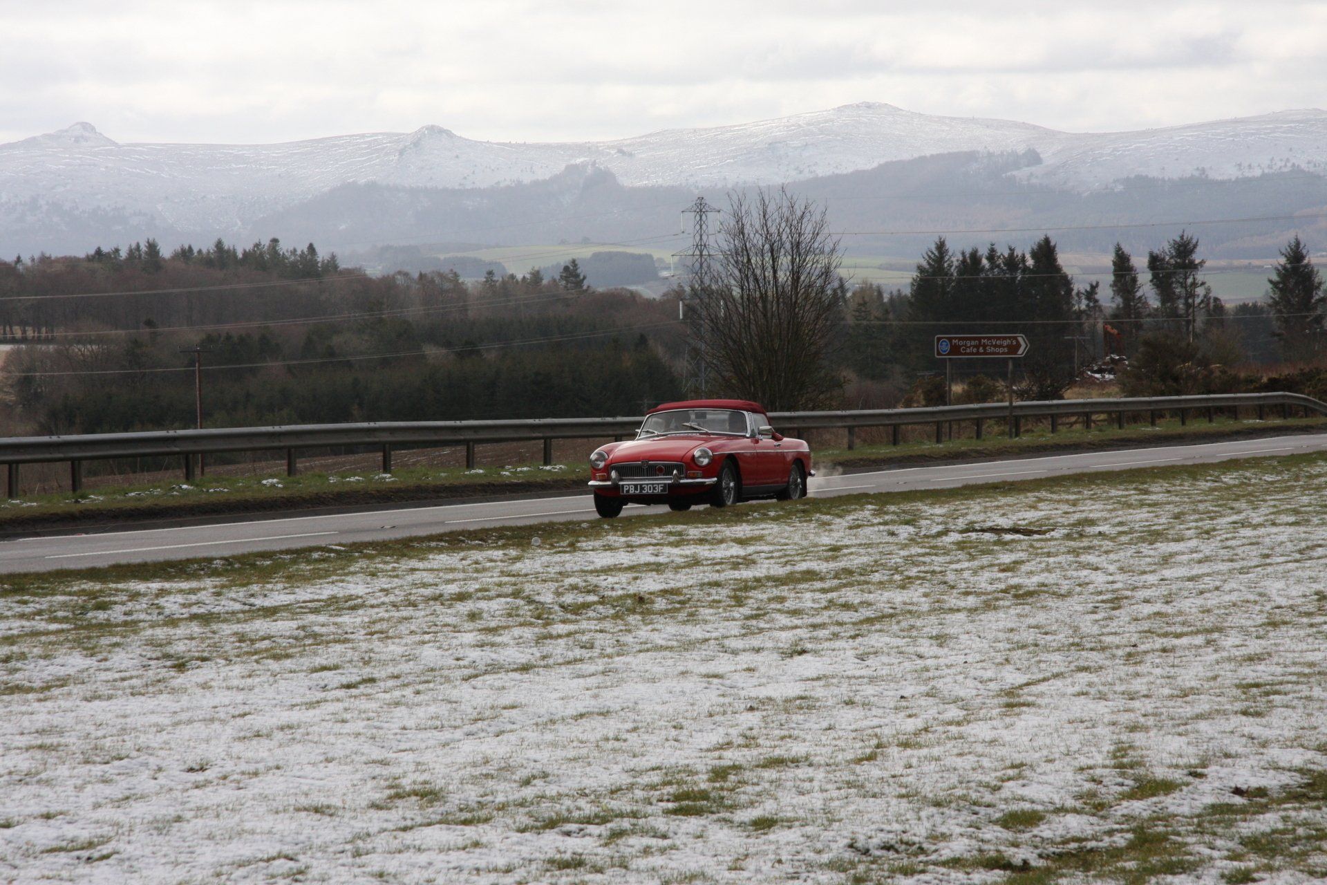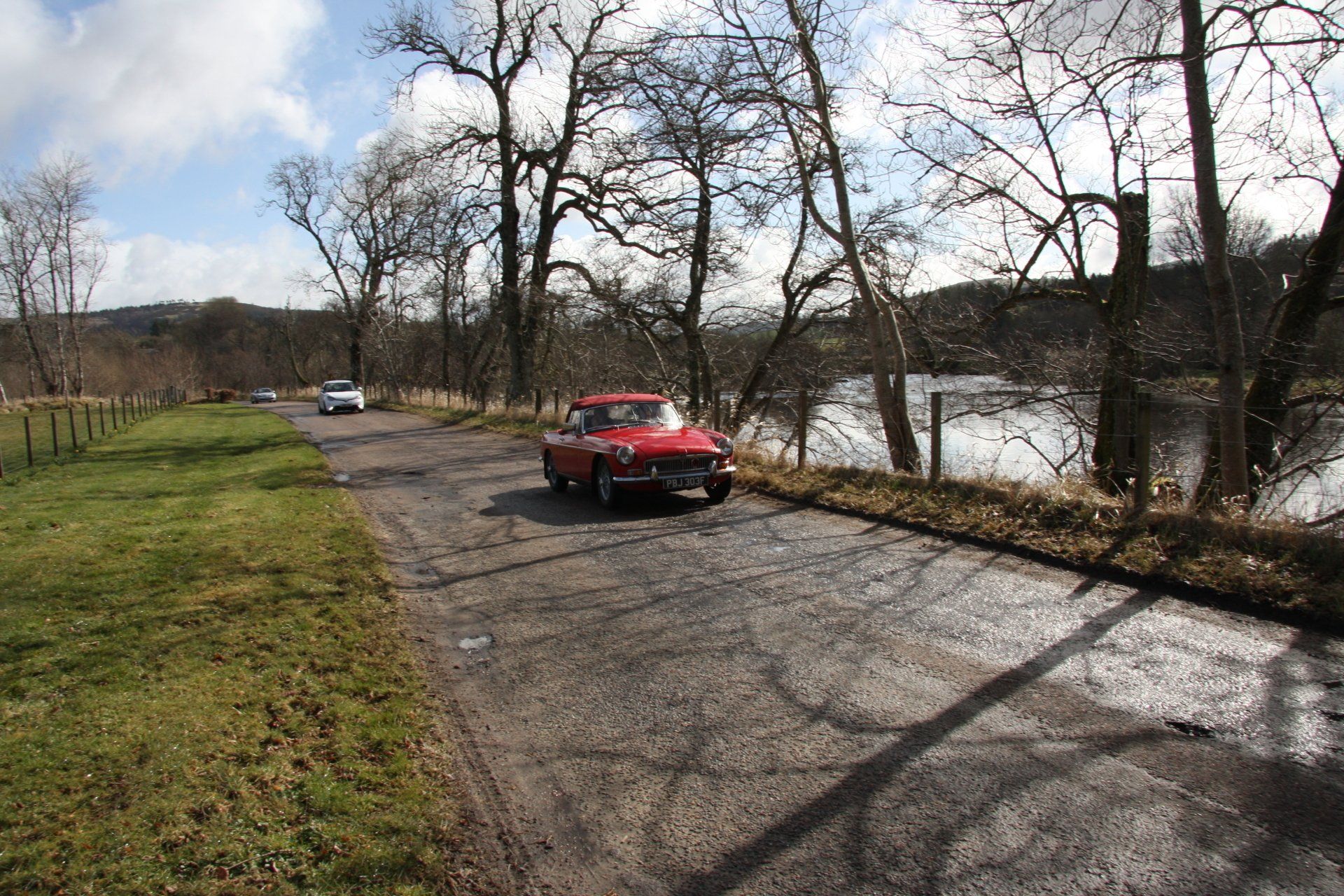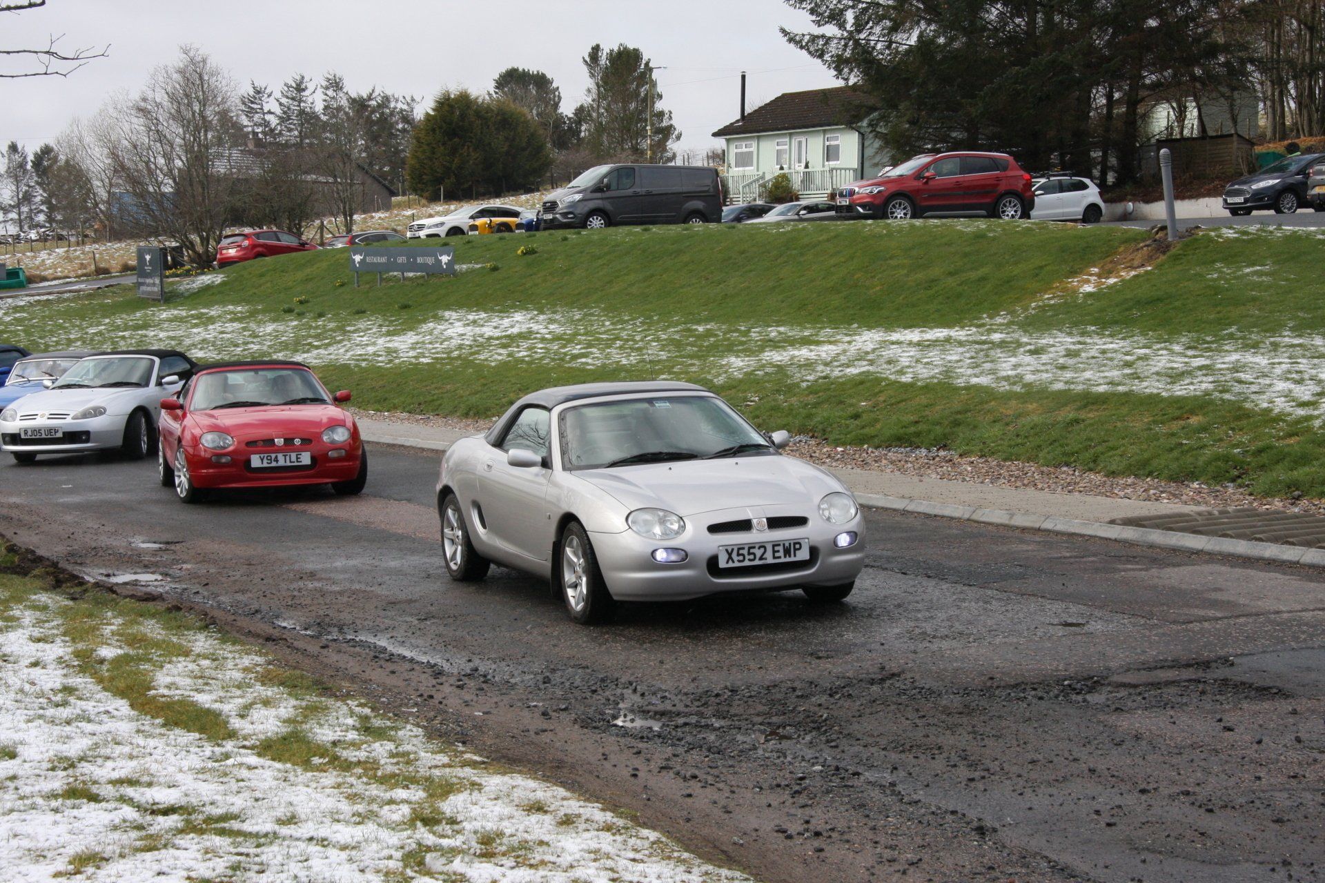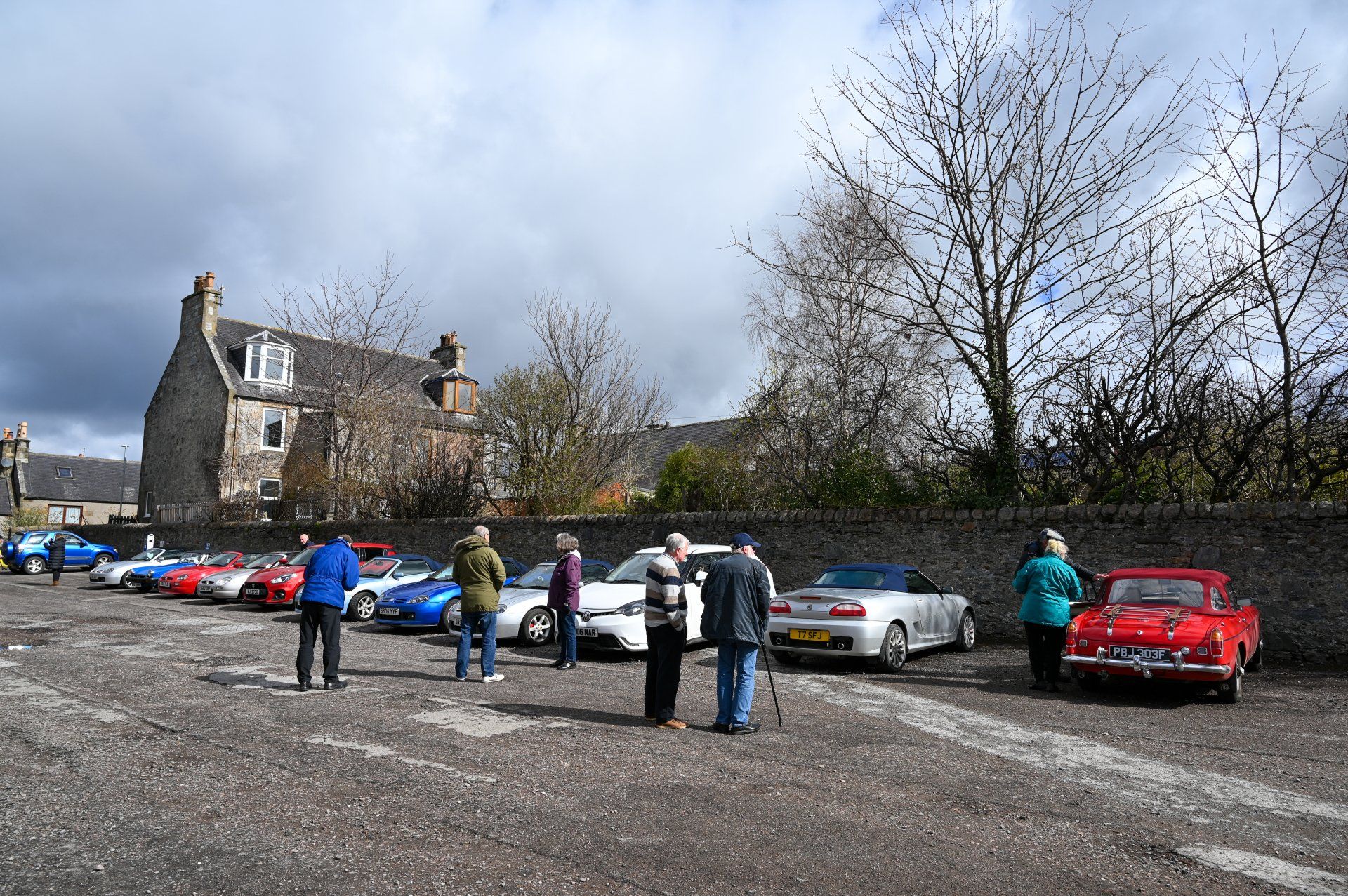 Luckily though, Saturday 9th dawned bright and sunny and although it was still quite cold, a healthy 15 cars congregated at Morgan McVeigh’s for a coffee and a bacon roll before heading off to Huntly for the start of the 2022 ‘Warm Up’ run. Curiously, all the roofs were up…..