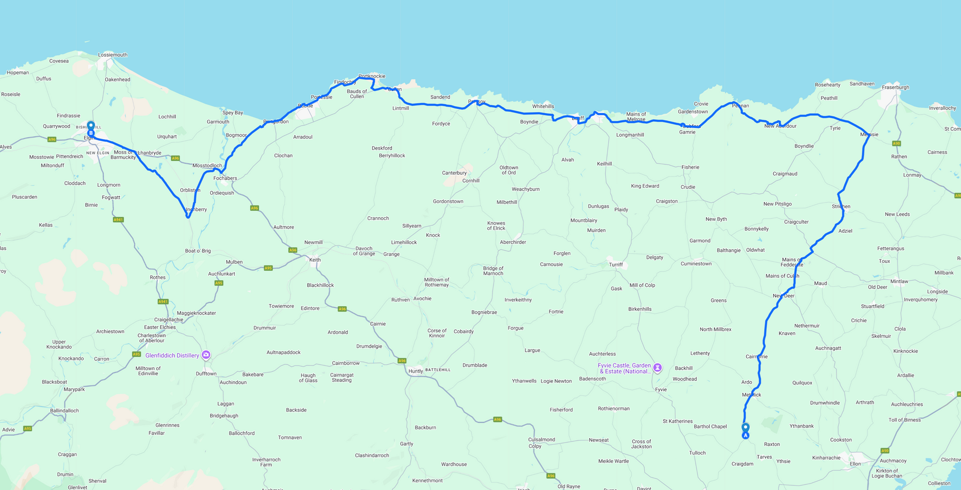 What is most likely to be our last road run of the 2025 season was an 84-mile jaunt along the Moray coast in bright sunshine on 28th September. 12 cars / 20 members and partners congregated at the very sociable hour of 10:00 at The Drive at Haddo for a breakfast roll and a coffee before setting off at around 11:00; heading initially NNE towards Fraserburgh before turning left at Memsie and heading along the scenic coastal road to Elgin.